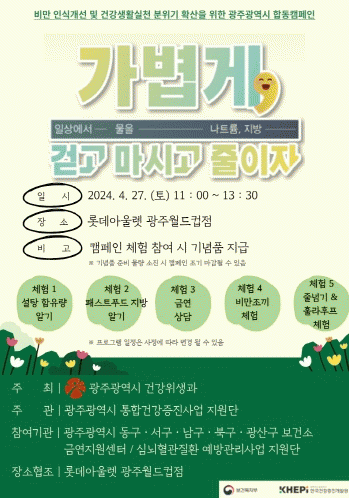 ÀÌ ±â°£ ÇÏ·ç ÃÖ´ë 1¸¸º¸¸¦ °È°í ¡®±¤ÁÖ±¤¿ª½Ã ÅëÇհǰÁõÁø»ç¾÷ Áö¿ø´Ü¡¯ īī¿ÀÅå ä³Î °èÁ¤ Ãß°¡ÈÄ 1´ë 1 ´ëÈ·Î ¸¸º¸ °È±â ÀÎÁõÀ» È®ÀÎÇÏ¸é µÈ´Ù. ÃÑ 3ȸ±îÁö Âü¿©ÇÒ ¼ö ÀÖ´Ù. À̺¥Æ®¿¡ ´ç÷µÇ¸é ¼±Âø¼ø 300¸í¿¡°Ô Ä¿ÇÇ ¸ð¹ÙÀÏÄíÆùÀ» ÁõÁ¤Çϰí, °Ç°ÇÑ ºñ¸¸¿¹¹æ°ü¸® ¹æ¹ý µî °Ç°¼Ò½ÄÀ» ¹ÞÀ» ¼ö ÀÖ´Ù.