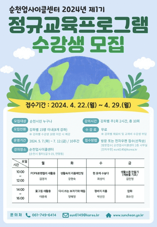 Âü°¡¸¦ Èñ¸ÁÇÏ´Â ¼øÃµ½Ã¹ÎÀº ¿À´Â 29ÀϱîÁö ¾÷»çÀÌŬ¼¾ÅÍ ¹æ¹® ¶Ç´Â ÀüÀÚ¿ìÆíÀ¸·Î ½ÅûÇÏ¸é µÈ´Ù. ¼ö°·á´Â ¹«·áÀ̸ç, °Áº° Àç·áºñ ¹× ºÎÀÚÀçºñ´Â ¼ö°»ýÀÌ ºÎ´ãÇÏ¿©¾ß ÇÑ´Ù.