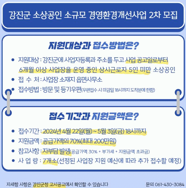 ÇØ´ç »ç¾÷ Áö¿ø ´ë»óÀÚ´Â °Áø±º¿¡ »ç¾÷ÀÚµî·Ï°ú ÁÖ¼Ò¸¦ µÎ°í »ç¾÷ °ø°íÀϷκÎÅÍ 6°³¿ù ÀÌ»ó »ç¾÷ÀåÀ» ¿î¿µ ÁßÀÎ »ó½Ã±Ù·ÎÀÚ 5ÀÎ ¹Ì¸¸ ¼Ò»ó°øÀÎÀ¸·Î °æ¿µÈ¯°æ °³¼±À» À§ÇØ ÁøÇàÇÏ´Â ºñ¿ë Áß °ø±Þ°¡¾×ÀÇ 70%(ÃÖ´ë 200¸¸¿ø)±îÁö Áö¿øÇÏ¸ç ³ª¸ÓÁö °ø±Þ°¡¾×ÀÇ 30%¿Í ºÎ°¡¼¼ µîÀº ¼Ò»ó°øÀÎ ½ÅûÀÚ ÀںδãÀÌ´Ù.