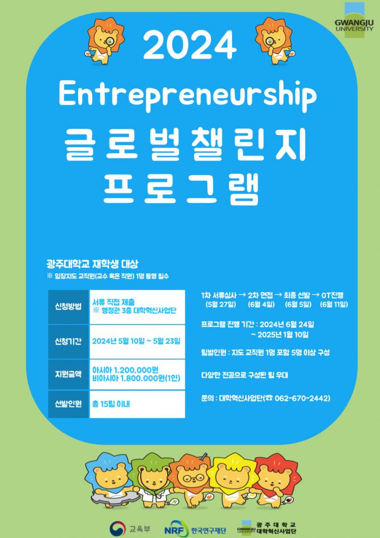 ¾Æ½Ã¾Æ±Ç ÆÀ¿¡´Â 1Àδç 120¸¸ ¿ø, ºñ¾Æ½Ã¾Æ±Ç ÆÀ¿¡´Â 1Àδç 180¸¸ ¿øÀÇ ¿¹»êÀ» Áö¿øÇϸç, Ȱµ¿ ¿Ï·á ÈÄ¿£ ÆÀº°¡¤°³Àκ° ÇÁ·Î±×·¥ °á°úº¸°í¼¸¦ Åä´ë·Î ¼º°ú °øÀ¯ÀÇ ½Ã°£µµ °¡Áú ¿¹Á¤ÀÌ´Ù. ±âŸ ÇÁ·Î±×·¥ °ü·Ã ±Ã±ÝÇÑ »çÇ×Àº ´ëÇÐÇõ½Å»ç¾÷´Ü(062-670-2442)À¸·Î ¹®ÀÇÇÏ¸é µÈ´Ù.