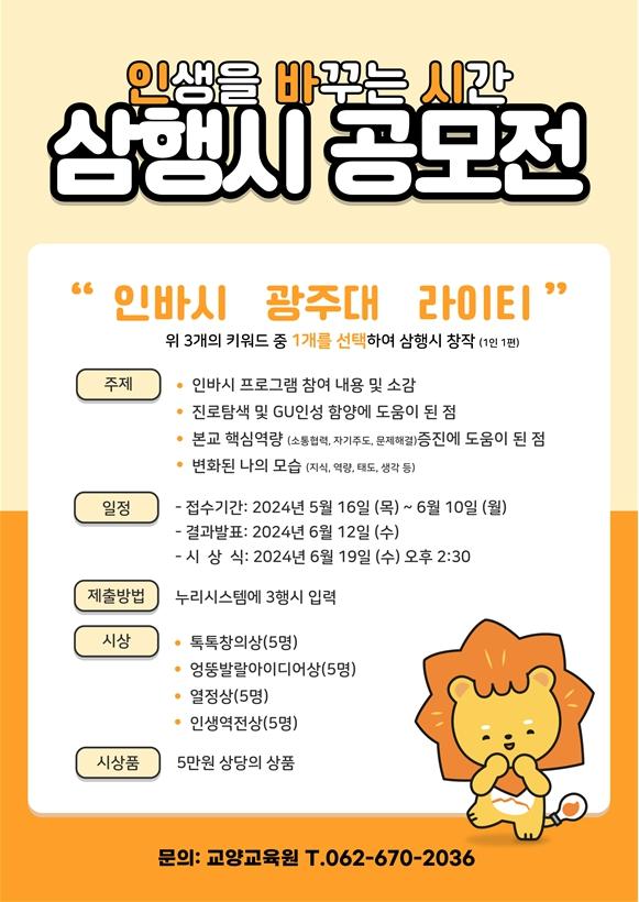 À̹ø »ïÇà½Ã °ø¸ðÀüÀº ¡®Àιٽá¯, ¡®±¤Áִ롯, ¡®¶óÀÌÆ¼¡¯ µî 3°³ÀÇ Å°¿öµå Áß 1°³¸¦ ¼±ÅÃÇØ ¡ãÀιٽà ÇÁ·Î±×·¥ Âü¿© ³»¿ë ¹× ¼Ò°¨ ¡ãÁø·ÎŽ»ö ¹× GUÀμº ÇԾ翡 µµ¿òÀÌ µÈ Á¡ ¡ãÇٽɿª·®(¼ÒÅëÇù·Â, ÀÚ±âÁÖµµ, ¹®Á¦Çذá) ÁõÁø¿¡ µµ¿òÀÌ µÈ Á¡ ¡ãº¯ÈµÈ ³ªÀÇ ¸ð½À(Áö½Ä, ¿ª·®, ŵµ, »ý°¢ µî)À» ÁÖÁ¦·Î ÀÛ¼ºÇÏ¸é µÈ´Ù.