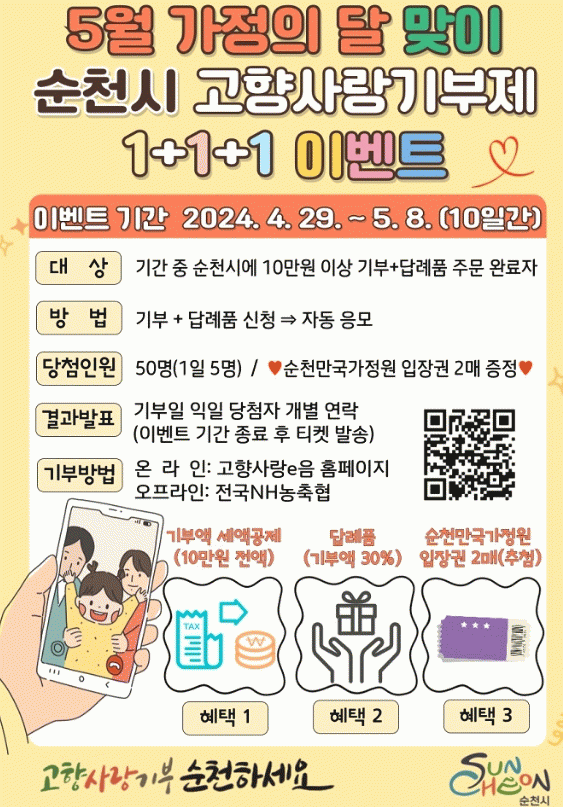 ½Ã °ü°èÀÚ´Â ¡°¼øÃµ¸¸±¹°¡Á¤¿ø °³Àå°ú °¡Á¤ÀÇ ´ÞÀ» ¸Â¾Æ ¼øÃµ °íÇâ»ç¶û±âºÎÁ¦¿¡ ´ëÇÑ °ü½ÉÀ» ³ôÀ̰í, ¼øÃµ¿¡ ±âºÎÇϽŠºÐµé¿¡°Ô °¨»çÀÇ ¸¶À½À» ÀüÇϰíÀÚ À̺¥Æ®¸¦ ÁغñÇß´Ù¡±¸ç, ¡°À̹ø 5¿ù °¡Á¤ÀÇ ´Þ¿¡´Â ºÎ¸ð´ÔÀÌ °è½Å ¼øÃµ¿¡ °íÇâ»ç¶û ±âºÎÇÏ¿© È¿ÀÚÈ¿³à µÇ½Ã°í, À̺¥Æ®¸¦ ÅëÇØ ±âºÎÀÇ »ÑµíÇÔÀ» ¼¼ ¹è·Î °¡Á®°¡½Ã±æ ¹Ù¶õ´Ù¡±°í ¸»Çß´Ù.