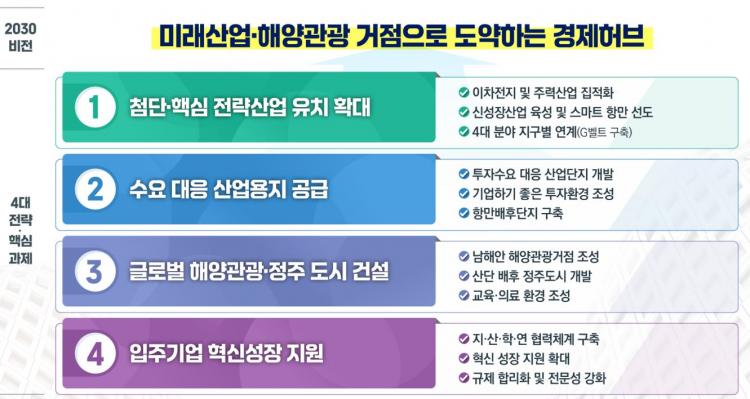 À̸¦ À§ÇØ ¡®Ã·´Ü¡¤ÇÙ½É Àü·«»ê¾÷ À¯Ä¡ È®´ë¡¯, ¡®¼ö¿ä ´ëÀÀ »ê¾÷¿ëÁö °ø±Þ¡¯, ¡®±Û·Î¹ú ÇØ¾ç°ü±¤¡¤Á¤ÁÖ µµ½Ã °Ç¼³¡¯, ¡®ÀÔÁÖ±â¾÷ Çõ½Å¼ºÀå Áö¿ø¡¯ À̶ó´Â 4´ë Àü·«À» ¼¼¿ì°í ¨çÀÌÂ÷ÀüÁö ¹× Áַ»ê¾÷ ÁýÀûÈ, ¨è½Å¼ºÀå»ê¾÷ À°¼º ¹× ½º¸¶Æ® Ç׸¸ ¼±µµ, ¨é4´ë ºÐ¾ß Áö±¸º° ¿¬°è(Gº§Æ® ±¸Ãà), ¨êÅõÀÚ¼ö¿ä ´ëÀÀ »ê¾÷´ÜÁö °³¹ß, ¨ë±â¾÷Çϱâ ÁÁÀº ÅõÀÚȯ°æ Á¶¼º, ¨ìÇ׸¸¹èÈÄ´ÜÁö ±¸Ãà, ¨í³²ÇØ¾È ÇØ¾ç°ü±¤°ÅÁ¡ Á¶¼º, ¨î»ê´Ü ¹èÈÄ Á¤ÁÖµµ½Ã °³¹ß, ¨ï±³À°¡¤ÀÇ·á ȯ°æ Á¶¼º, ¨ð Áö¡¤»ê¡¤ÇС¤¿¬ Çù·Âü°è ±¸Ãà, ¨ñÇõ½Å¼ºÀå Áö¿øÈ®´ë, ¨ò±ÔÁ¦ÇÕ¸®È ¹× Àü¹®¼º °È' µî ÃÑ ¿µÎ °¡ÁöÀÇ ÇٽɰúÁ¦¸¦ ¼³Á¤Çß´Ù.