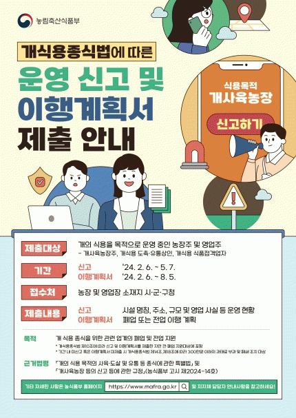 ÀÌ¿¡ µû¶ó ±âÁ¸ ½Ä¿ë °³ °ü·Ã »ç¾÷ÀåÀ» ¿î¿µ ÁßÀÎ »ç¾÷ÀÚ´Â 5¿ù 7ÀϱîÁö ¿î¿µ½Å°í¼¸¦ Á¦ÃâÇØ¾ß Çϸç, ½Å°íÇÑ ¾÷ü´Â 8¿ù 5ÀϱîÁö Àü¡¤Æó¾÷ °èȹÀÌ ´ã±ä ÀÌÇà°èȹ¼¸¦ Á¦ÃâÇØ¾ß ÇÑ´Ù.