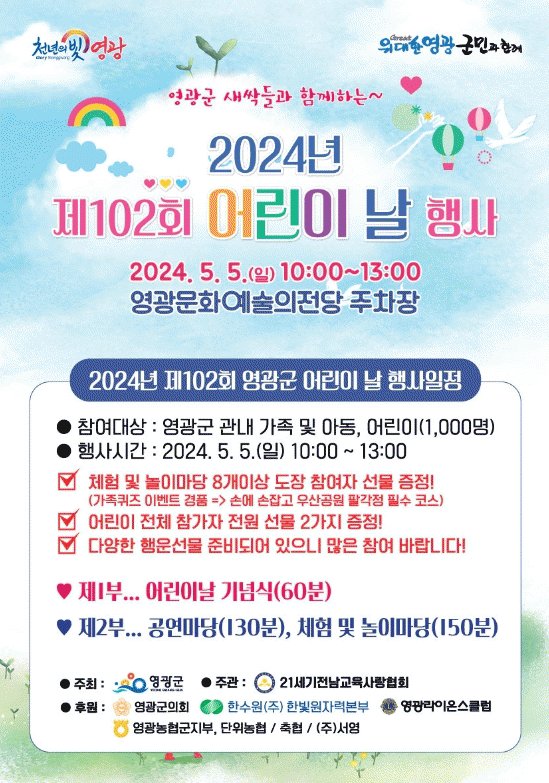 °Á¾¸¸ ¿µ±¤±º¼ö´Â ¡°¾î¸°À̳¯À» ¸ÂÀÌÇØ ¿Â °¡Á·ÀÌ ÇÔ²² Áñ±æ ¼ö ÀÖ´Â ´Ù¾çÇÑ Çà»ç¿Í ÇÁ·Î±×·¥À» ÁغñÇß´Ù¡±¸ç ¡°¸ðµç ¾î¸°À̵éÀÌ °Ç°ÇÏ°Ô ¼ºÀåÇØ ²Þ°ú Èñ¸ÁÀ» ¸¶À½²¯ ÆîÄ¥ ¼ö ÀÖ´Â ¿µ±¤±ºÀÌ µÉ ¼ö ÀÖµµ·Ï ¼¼½ÉÇÏ°Ô ³ë·ÂÀ» ±â¿ï¿© ³ª°¡°Ú´Ù¡±°í ÀüÇß´Ù.