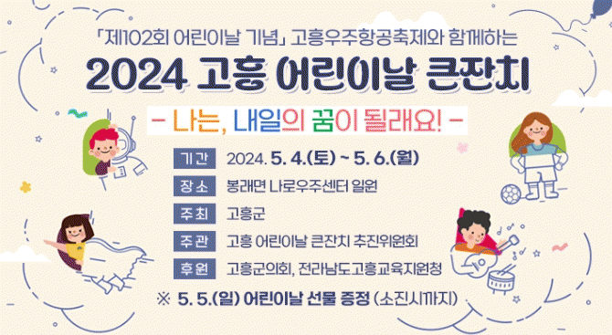 ¾î¸°À̳¯ Å«ÀÜÄ¡ ÃßÁøÀ§¿øÈ¸(À§¿øÀå ¹Ú°æ¼®) ÁÖ°üÀ¸·Î ¿¸®´Â À̳¯ Çà»ç´Â ¡®Á¦14ȸ °íÈï¿ìÁÖÇ×°øÃàÁ¦¡¯¿Í º´ÇàÇØ ÃßÁøÇÏ°Ô µÆÀ¸¸ç, 5¿ù 4ÀϺÎÅÍ 6ÀϱîÁö 3Àϰ£ ÃÑ 100¿© Á¾ÀÇ ´Ùä·Î¿î ÇÁ·Î±×·¥ÀÌ ÆîÃÄÁú ¿¹Á¤ÀÌ´Ù.