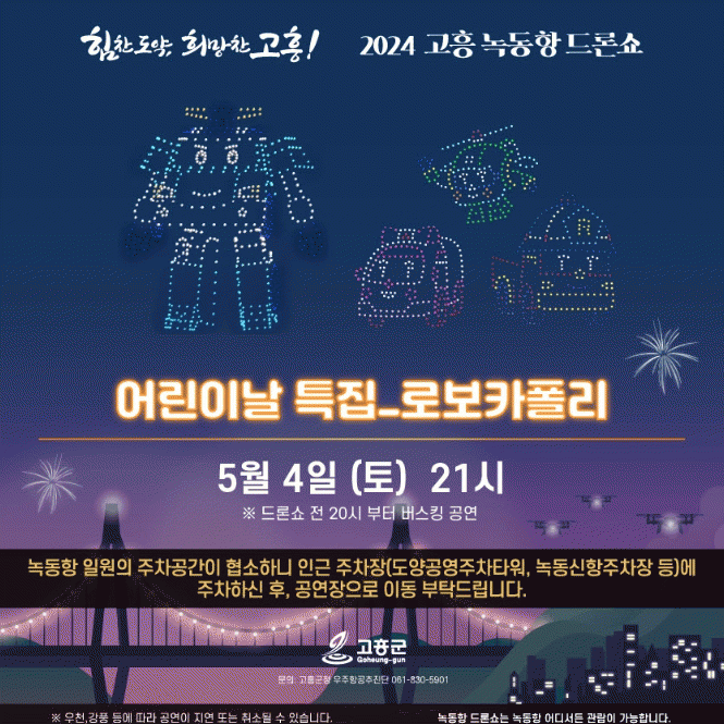 ÇÑÆí, °íÈï ³ª·Î¿ìÁÖ¼¾ÅͰ¡ À§Ä¡ÇØ ÀÖ´Â ºÀ·¡¸é ÀÏ¿ø¿¡¼´Â ¿À´Â 5¿ù 4ÀϺÎÅÍ 3Àϰ£ ¡®Á¦14ȸ °íÈï¿ìÁÖÇ×°øÃàÁ¦¡¯¿Í ¡®Á¦7ȸ ³ª·Îµµ ûÁ¤¼ö»ê¹° ÃàÁ¦¡¯°¡ µ¿½Ã¿¡ ¿¸®°í ÀÖ¾î µå·Ð¼î °ø¿¬ À̿ܿ¡µµ ³·¿£ ´Ù¾çÇÑ º¼°Å¸®, Áñ±æ°Å¸®, ¸Ô°Å¸®°¡ dzºÎÇØ ¾ÆÀÌ¿Í °¡Á·µé ¸ðµÎ°¡ °íÈï¿¡¼ÀÇ ÇູÇÑ ½Ã°£À» ¸¸µé¾î °¥ ¼ö ÀÖ´Ù.