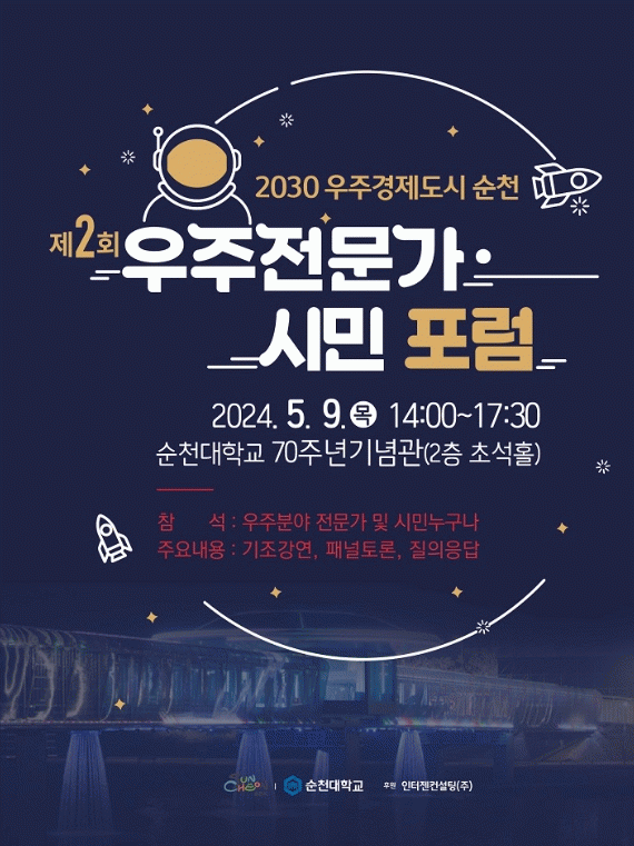 ¼øÃµ½Ã Ç×°ø¿ìÁÖ»ê¾÷ Á¤Ã¥À§¿ø, Àü¹®°¡, ±â¾÷, °ø¹«¿ø, ´ëÇб³, ½Ã¹Î µî °¢ ºÐ¾ß¿¡¼ Âü¼®ÇÏ´Â À̹ø Æ÷·³Àº ¿ìÁÖ °ÅÁ¡µµ½Ã·Î µµ¾à ÁßÀÎ ¼øÃµ½Ã°¡ ¿ìÁÖ»ê¾÷À» ¾î¶»°Ô À°¼ºÇØ¾ß Çϴ°¡¿¡ ´ëÇÑ ÇâÈÄ ºñÀüÀ» Á¤¸³Çϱâ À§ÇÑ ±âȹ ÇÁ·Î±×·¥ÀÌ´Ù.