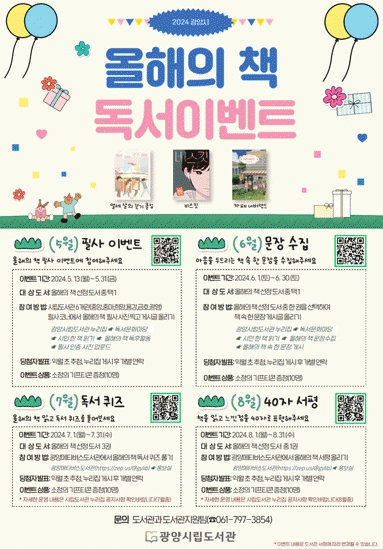 ±¤¾ç½Ã¸³µµ¼°ü °ü°èÀÚ´Â ¡°¼Æò ÀÛ¼º, µµ¼ ÇÊ»ç, µ¶¼ ÄûÁî µîÀÇ µ¶ÈÄ È°µ¿À» ÅëÇØ Ã¥À» º¸´Ù ±íÀÌ ÀÌÇØÇϰí Ã¥ Àб⸦ Áñ±æ ¼ö ÀÖ´Â ±âȸ°¡ µÇ±æ ¹Ù¶õ´Ù¡±¸ç ¡°2024 ±¤¾ç½Ã ¿ÃÇØÀÇ Ã¥¿¡ ¸¹Àº °ü½É°ú Âü¿©¸¦ ºÎʵ台´Ù¡±°í ÀüÇß´Ù.