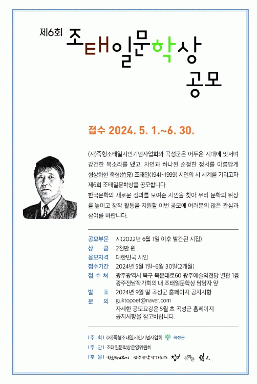 (»ç)Á×ÇüÁ¶ÅÂÀϽÃÀαâ³ä»ç¾÷ȸ(ÀÌ»çÀå ¹Ú¼®¹«)¿Í °î¼º±ºÀÌ ÁÖÃÖÇϰí, Çѱ¹ÀÛ°¡È¸ÀÇ, ±¤ÁÖÀü³²ÀÛ°¡È¸ÀÇ, âºñ, ¹®ÇеéÀÌ ÈÄ¿øÇÏ´Â 'Á¦6ȸ Á¶ÅÂÀϹ®Çлó' Á¢¼ö ±â°£Àº 5¿ù 1ÀϺÎÅÍ 6¿ù 30ÀϱîÁö 2°³¿ù°£À̸ç, ÃÖ±Ù 2³â À̳»(2022³â 6¿ù 1ÀÏ ÀÌÈÄ)¿¡ ¹ß°£ÇÑ ½ÃÁýÀ» ½ÃÀÎ º»ÀÎÀÌ Á¦ÃâÇϰųª ÃßõÀ§¿øÀÇ ÃßõÀ» ÅëÇØ ÀÀ¸ðÇÒ ¼ö ÀÖ´Ù.