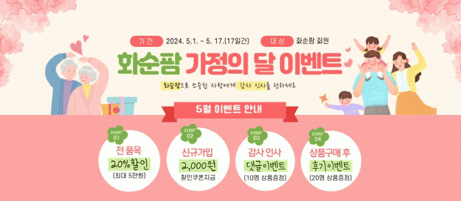 ÇöÀç ȼøÆÊ¿¡¼´Â 5¿ù 17ÀϱîÁö °¡Á¤ÀÇ ´Þ, °¨»çÀÇ ´Þ À̺¥Æ®¸¦ ÁøÇàÇϰí ÀÖÀ¸¸ç, Àü »óǰ 20% ÇÒÀÎ ÄíÆù(ÃÖ´ë 5¸¸ ¿ø)°ú ½Å±Ôȸ¿ø¿¡°Ô´Â 2,000¿ø ÇÒÀÎ ÄíÆùÀ» Ãß°¡·Î Áö±ÞÇÑ´Ù.