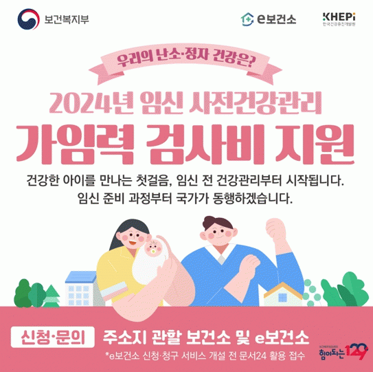 ¶ÇÇÑ ¿ÃÇØ 4¿ùºÎÅÍ ±¹°¡ Áö¿ø»ç¾÷ÀÎ 'ÀӽŠ»çÀü°Ç°°ü¸® »ç¾÷'À» ÃßÁøÇØ ¾ÆÀ̸¦ °èȹÇϰí ÀÖ´Â ºÎºÎ¸¦ ´ë»óÀ¸·Î Àӽа¡ÀÓ·Â °ü·Ã °Ë»ç¸¦ Áö¿øÇÑ´Ù. ´Ü, ºÎºÎ Áß ¿©¼ºÀÌ °¡ÀÓ±â(15~49¼¼)ÀÎ °æ¿ì¿¡ ÇÑÇØ Áö¿øµÈ´Ù.