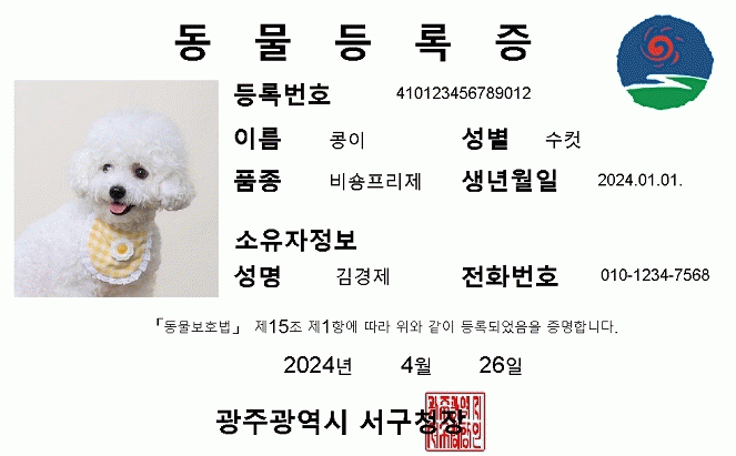 Ä«µåÇü µî·ÏÁõÀº ±âÁ¸ Á¾À̹®¼ µî·ÏÁõº¸´Ù ÈÞ´ëÇϱâ ÁÁ°í µî·Ï¹øÈ£ 15ÀÚ¸®¿Í ¼ÒÀ¯ÀÚÀÇ À̸§, ¿¬¶ôó, ¹Ý·Áµ¿¹° À̸§, ǰÁ¾, ¼ºº° µîÀÌ »ó¼¼ ±âÀçµÈ´Ù.