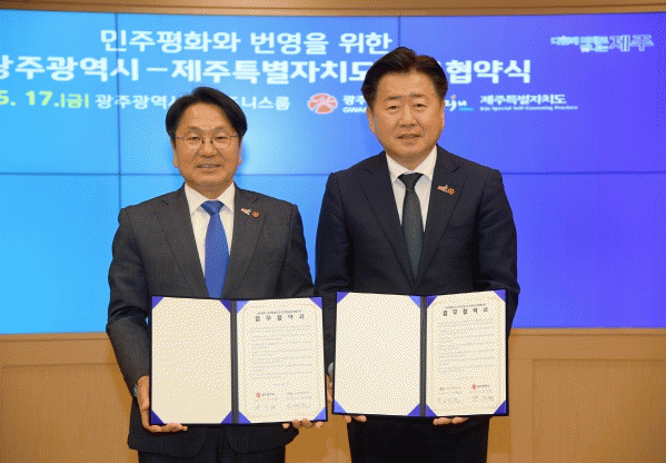 ±¤ÁÖ±¤¿ª½Ã¿Í Á¦ÁÖÆ¯º°ÀÚÄ¡µµ´Â 17ÀÏ ¿ÀÈÄ ±¤ÁÖ½Ãû¿¡¼ °±âÁ¤ ½ÃÀå°ú ¿À¿µÈÆ Áö»ç°¡ Âü¼®ÇÑ °¡¿îµ¥ À뱂 ÆòÈ¿Í ¹ø¿µÀ» À§ÇÑ ¡®»ó»ý¹ßÀü ¾÷¹«Çù¾à¡¯À» ü°áÇß´Ù.