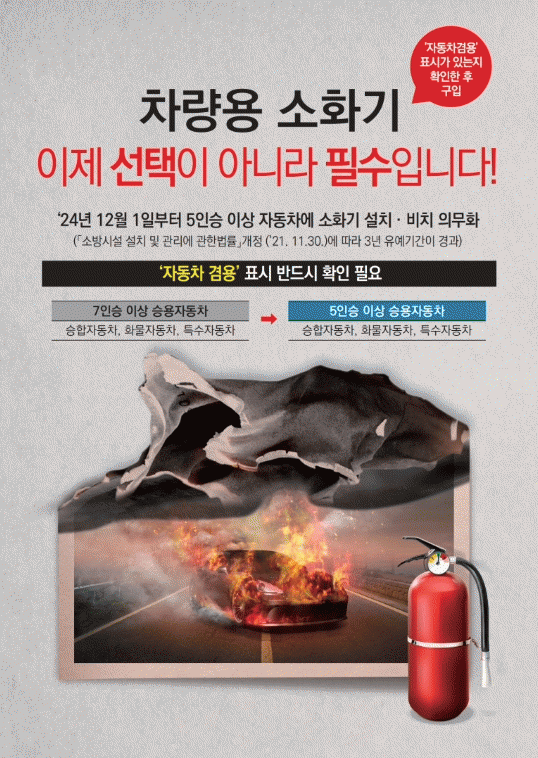 ¼Ò¹æÃ»Àº 2021³â 11¿ù¿¡ °³Á¤ÇÑ ¡®¼Ò¹æ½Ã¼³ ¼³Ä¡ ¹× °ü¸®¿¡ °üÇÑ ¹ý·ü¡¯ÀÇ 3³â À¯¿¹±â°£ÀÌ °æ°úÇÔ¿¡ µû¶ó ¿ÃÇØ 12¿ù 1ÀϺÎÅÍ ¡®5Àν ÀÌ»ó ½Â¿ëÂ÷¡¯ÀÇ °æ¿ì¶ó¸é ±Ç°í»çÇ×ÀÌ ¾Æ´Ñ Àǹ«·Î ¼³Ä¡ÇØ¾ß Çϸç, ¹Ì¼³Ä¡ ¶Ç´Â ¹ÌºñÄ¡ ½Ã ´Ü¼Ó ´ë»óÀÌ µÇ¸ç ÀÚµ¿Â÷ °Ë»ç ÁøÇà ½Ã¿¡µµ ºÒÇÕ°Ý »çÇ×ÀÌ µÈ´Ù.