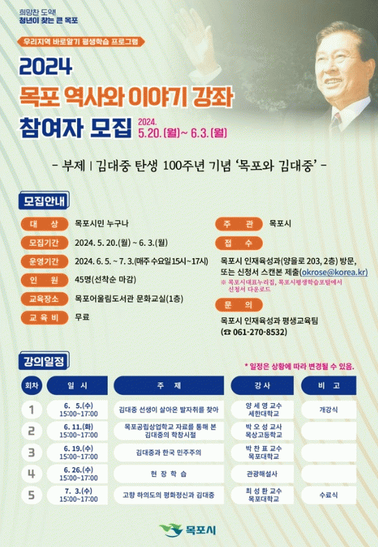 ÀÌ °Á´ Áö¿ª Àü¹®°¡µéÀÇ ´Ù¾çÇÑ °ÀǸ¦ ÅëÇØ ¸ñÆ÷ÀÇ ¿ª»ç¿Í ¹®È, ¿¹¼ú µî ½Ã¿¡ »êÀçÇÑ ±Ù´ë¹®ÈÀ¯»ê¿¡ ´ëÇØ ü°èÀûÀ¸·Î ¹è¿ï ¼ö ÀÖ´Â Æò»ýÇнÀ ÇÁ·Î±×·¥ÀÌ´Ù.
