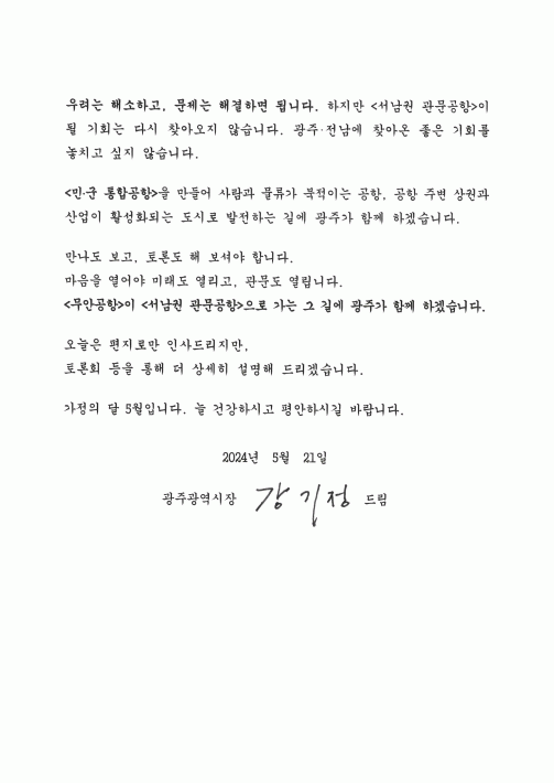°±âÁ¤ ±¤ÁÖ±¤¿ª½ÃÀåÀº 21ÀÏ ¡°¹«¾È°øÇ׿¡ ´ëÇØ µå¸®°í ½ÍÀº ¸»¾¸ÀÌ ¸¹¾Æ ÆæÀ» µé¾ú´Ù¡±¸ç ¹«¾È±º¹Î¿¡°Ô µå¸®´Â ¡®¾à¼ÓÀÇ ÆíÁö1¡¯¸¦ ¶ç¿ü´Ù.