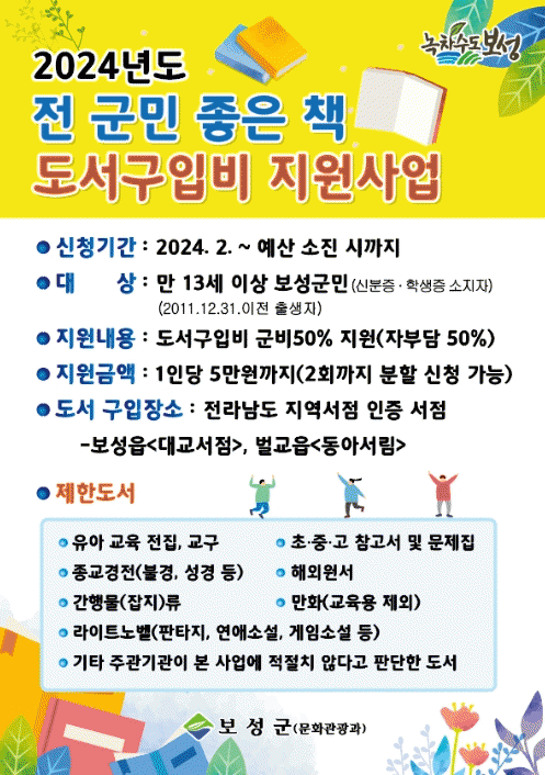 ¡®Àü ±º¹Î ÁÁÀº Ã¥ µµ¼ ±¸ÀÔ Áö¿ø»ç¾÷¡¯Àº º¸¼º±º¹Î(Áֹεî·Ï»ó 13¼¼ ÀÌ»ó º¸¼º±º °ÅÁÖÀÚ) ¶Ç´Â Áö¿ª ¼ÒÀç Áß°íµîÇлý¿¡°Ô µµ¼ ±¸ÀÔºñÀÇ ÀϺθ¦ Áö¿øÇØ ÁÖ´Â »ç¾÷ÀÌ´Ù.
