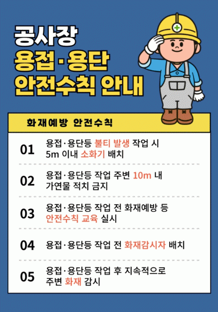 ÀÌ¿¡ ÀÛ¾÷ÀÚµéÀº ¿ëÁ¢¤ý¿ë´Ü ÀÛ¾÷ ½Ã ºÒƼ·Î ÀÎÇÑ ÈÀ縦 ¿¹¹æÇϱâ À§Çؼ´Â ¡ã¿ëÁ¢¤ý¿ë´Ü ÀÛ¾÷ ½Ã ÁÖº¯ °¡¿¬¹° Á¦°Å ¡ãÀÛ¾÷ ÈÄ ÀÜ¿© ºÒ¾¾ È®ÀÎ ¡ãÀÛ¾÷ÀÚ 5m À̳» ¼Òȱ⠺ñÄ¡ ¡ãÈÀç°¨½ÃÀÚ ¹èÄ¡ µî °ø»çÀå ³» ÈÀç ¾ÈÀü¼öÄ¢À» ÁؼöÇØ¾ß ÇÑ´Ù.