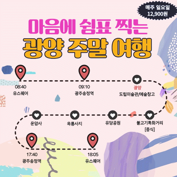 ±¤¾çÁÖ¸»¿©ÇàÀº ±¤¾ç¿¹¼úâ°í¿Í Àü³²µµ¸³¹Ì¼ú°ü, À¯´ç°ø¿ø, ¿Á·æ»çµ¿¹é³ª¹«½£ µî¿¡¼ ¹®È¿Í Ä¡À¯¿¡ ´ëÇÑ °¥ÁõÀ» ÇØ¼ÒÇÏ´Â À£´Ï½º¿©ÇàÀÌ´Ù.