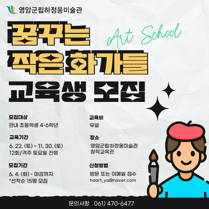 ±³À°¿¡ ´ëÇÑ ÀÚ¼¼ÇÑ ¾È³»´Â ÇÏÁ¤¿õ¹Ì¼ú°ü ȨÆäÀÌÁö¿¡¼ º¼ ¼ö ÀÖ°í, ±³À° Âü¿© ½Åû¼´Â ¹Ì¼ú°ü ¹æ¹® ¶Ç´Â À̸ÞÀÏ·Î Á¢¼öÇÒ ¼ö ÀÖ´Ù.