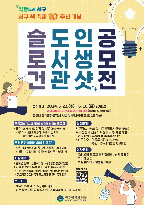À̹ø °ø¸ðÀüÀº ½½·Î°Ç °ø¸ð¿Í µµ¼°ü Àλý¼¦ °ø¸ð·Î ³ª´µ¾î ÁøÇàµÈ´Ù. ½½·Î°Ç °ø¸ð´Â Ã¥ÃàÁ¦ÀÇ °¡Ä¡¿Í ¿ªÇÒÀ» ´ãÀº 15ÀÚ À̳»ÀÇ °£°áÇϰí ÇÔÃàÀûÀΠǥ¾î¸¦ Á¢¼ö¹Þ°í, Àλý¼¦ °ø¸ð´Â ¼±¸ °ü³» µµ¼°ü¿¡¼ Çà»ç.µ¶¼.µµ¼°ü Àü°æ µîÀ» ÂïÀº Ãß¾ï»çÁøÀ» »Ì´Â´Ù.
