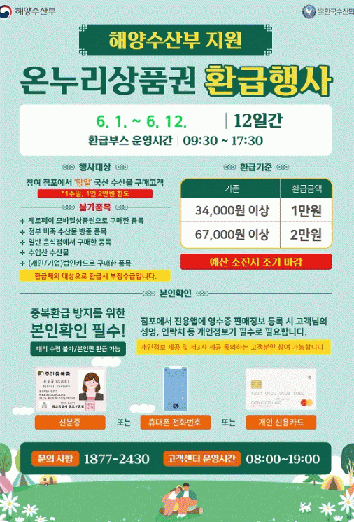 ±¹³»»ê¼ö»ê¹° ¶Ç´Â ±¹³»»ê¼ö»ê¹° ¿øÀç·á ºñÁßÀÌ 70% ÀÌ»óÀÎ ´Ü¼ø°¡°øÇ°À» ´ë»óÀ¸·Î ´çÀÏ ±¸¸Å±Ý¾×ÀÌ 3¸¸4õ¿ø ÀÌ»ó 6¸¸7õ¿ø ¹Ì¸¸ÀÏ °æ¿ì 1¸¸¿øÀ», 6¸¸7õ¿ø ÀÌ»óÀº 2¸¸¿øÀ» ¿Â´©¸®»óǰ±ÇÀ¸·Î ȯ±Þ¹ÞÀ» ¼ö ÀÖ´Ù.