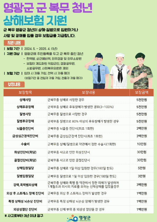 Áö¿ø´ë»óÀº ¿µ±¤±º¿¡ ÁÖ¼Ò¸¦ µÎ°í ÀÖ´Â ±º º¹¹« ÁßÀΠû³âÀ¸·Î º´¿ª¹ý¿¡ µû¸¥ Çö¿ªº´, »ó±Ù¿¹ºñ¿ª, Àǹ«°æÂû ¹× Àǹ«¼Ò¹æ¿øÀÌ ÇØ´çµÇ¸ç, º¸ÇèÀÌ Á¦µµÈµÈ Á÷¾÷±ºÀÎ, °æÂû°ø¹«¿ø, ¼Ò¹æ°ø¹«¿ø, »çȸº¹¹«¿ä¿øÀº Á¦¿ÜµÈ´Ù.