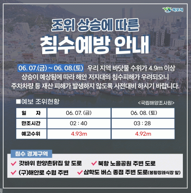 ÇÑÆí, ¸ñÆ÷½Ã´Â ¹Ù´å¹° ¼öÀ§°¡ Á¶¼®Ç¥»ó Á¶°í 4.90mÀÌ»óÀÏ °æ¿ì ÇØ¼ö À§ÇèÀÏ·Î ÁöÁ¤ÇØ ½Ã¹ÎµéÀÇ Àç»êÇÇÇØ°¡ ¹ß»ýÇÏÁö ¾Êµµ·Ï ħ¼öÇÇÇØ ¿¹¹æ¿¡ Àû±Ø ´ëóÇϰí ÀÖ´Ù.