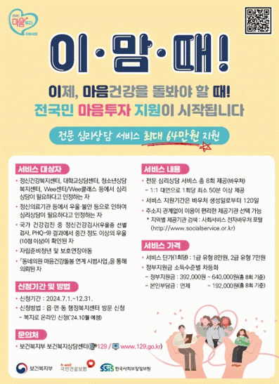 ´ë»óÀÚ´Â °ÅÁÖÁö¿Í »ó°ü¾øÀÌ Á¦°ø±â°üÀ» ¼±ÅÃÇÒ ¼ö ÀÖ°í, ¼Òµæ ¼öÁØ¿¡ µû¸¥ º»Àκδã±ÝÀ» ³³ºÎÇϰí ÀÌ¿ëÇÒ ¼ö ÀÖ´Ù. ¼ºñ½º Á¦°ø±â°üÀº ÀÌ¿ëÀÚ¿Í °è¾àÀ» ü°áÇÑ ÈÄ 1´ë 1 ´ë¸éÀ¸·Î Àü¹® ½É¸®»ó´ã ¼ºñ½º¸¦ Á¦°øÇÑ´Ù.
