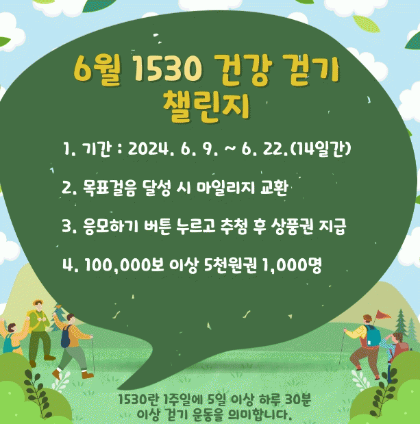 ¡®1530 °Ç° °È±â¡¯´Â 1ÁÖÀÏ¿¡ 5ÀÏ ÀÌ»ó ÇÏ·ç 30ºÐ ÀÌ»ó °È±â ¿îµ¿À» ÀǹÌÇϸç, 縰Áö´Â ±¤¾ç½Ã¹ÎÀÌ¸é ´©±¸³ª Âü¿© °¡´ÉÇÏ°í ¿À´Â 9ÀϺÎÅÍ 22ÀϱîÁö ÃÑ 14Àϰ£ ÁøÇàµÈ´Ù.