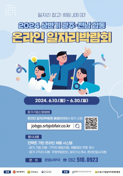 Âü¿©¸¦ ¿øÇÏ´Â ±â¾÷Àº 2024 »ó¹Ý±â ±¤ÁÖ¡¤Àü³² ¿Â¶óÀΠä¿ë¹Ú¶÷ȸ ´©¸®ÁýÀ» ÅëÇØ ±â¾÷ Á¤º¸ ¹× ä¿ë°ø°í¸¦ µî·ÏÇØ ½ÅûÇÒ ¼ö ÀÖ´Ù. ±¸Á÷ÀÚ´Â À̷¼¿Í ÀÚ±â¼Ò°³¼¸¦ ÀÛ¼ºÇØ Á÷Á¢ Âü¿©±â¾÷¿¡¼ µî·ÏÇÑ Ã¤¿ë°ø°í¿¡ ¿Â¶óÀÎÀ¸·Î Áö¿øÇÏ¸é µÈ´Ù.