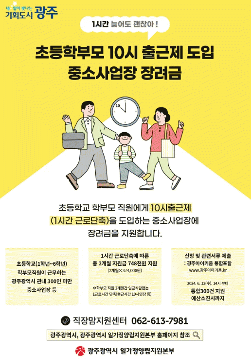 Ãʵî ÇкθðÀÇ ±Ù·Î½Ã°£ 1½Ã°£ ´ÜÃà¿¡ µû¸¥ ±Þ¿©´Â ±¤Áֽð¡ Àå·Á±ÝÀ¸·Î »ç¾÷Àå¿¡ Áö¿øÇÑ´Ù.