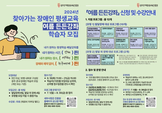 ±¤ÁÖÀÎÀçÆò»ý±³À°ÁøÈï¿ø ÀÌÃá¹® ¿øÀåÀº ¡°´©±¸³ª ¿øÇÏ´Â Àå¼Ò¿¡¼ ¾çÁúÀÇ Æò»ý±³À° ÇÁ·Î±×·¥¿¡ Âü¿©ÇÒ ¼ö ÀÖµµ·Ï Àå¾ÖÀÎÀÇ Æò»ý±³À° Âü¿©±âȸ È®´ë¸¦ À§ÇØ ³ë·ÂÇϰڴ١±°í ¸»Çß´Ù.