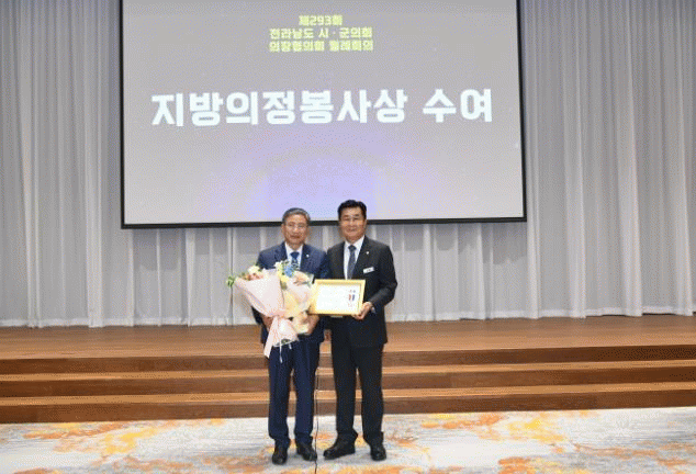 ¶ÇÇÑ, Á¦9´ë Àü¹Ý±â ³ªÁÖ½ÃÀÇȸ ÀÇÀåÁ÷À» ¼öÇàÇÏ¸é¼ ÀÇȸÀÇ ¸ñ¼Ò¸®¸¦ ÇѰ÷À¸·Î ¸ðÀ¸´Âµ¥ Èû¾²°í ½Ã¹ÎÀÇ º¹¸®ÁõÁø°ú ½ÃÁ¤¹ßÀüÀ» À§ÇØ Á÷¹«¸¦ ¼öÇàÇÑ Á¡À» ³ôÀÌ Æò°¡¹Þ¾Æ À̹ø »óÀ» ¹Þ°Ô µÆ´Ù.