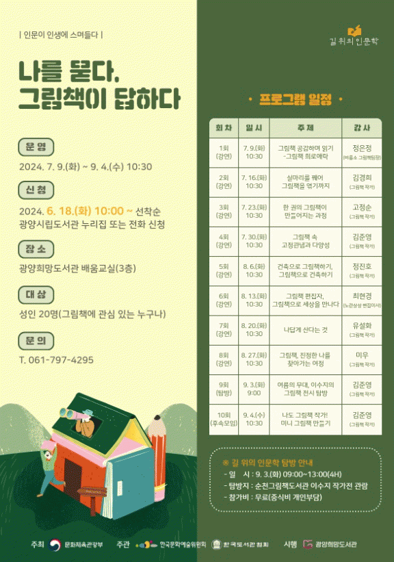ÇÁ·Î±×·¥Àº '³ª¸¦ ¹¯´Ù, ±×¸²Ã¥ÀÌ ´äÇÏ´Ù'¸¦ ÁÖÁ¦·Î ¡ã°íÁ¤¼ø(±×¸²Ã¥ ÀÛ°¡) ¡ã±è°æÈñ(±×¸²Ã¥ ÀÛ°¡) ¡ã±èÁØ¿µ(±×¸²Ã¥ ÀÛ°¡) ¡ã¹Ì¿ì(±×¸²Ã¥ ÀÛ°¡) ¡ãÀ¯¼³È(±×¸²Ã¥ ÀÛ°¡) ¡ãÁ¤ÀºÁ¤(ºñ·æ¼Ò ±×¸²Ã¥ ÆÀÀå) ¡ãÁ¤ÁøÈ£(±×¸²Ã¥ ÀÛ°¡) ¡ãÃÖÇö°æ(³ë¶õ»ó»ó ÆíÁýÀÌ»ç) °»ç°¡ ȸÂ÷º° °¿¬ÀÚ·Î ³ª¼±´Ù.