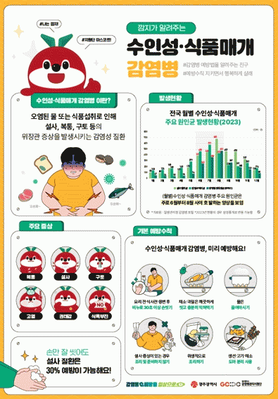 ¼öÀμº¡¤½Äǰ¸Å°³ °¨¿°º´ Áß ÁÖ·Î ¹ß»ýÇÏ´Â Àå°ü°¨¿°Áõ(»ì¸ð³Ú¶ó, įÇʷιÚÅÍ, À庴¿ø¼º´ëÀå±Õ)ÀÇ 2023³â ±¤ÁÖÁö¿ª ¹ß»ý ÇöȲÀ» º¸¸é ÃÑ 493°ÇÀÌ ½Å°íµÆ°í, ÀÌ Áß 239°Ç(48%)Àº ÁÖ·Î 6~8¿ù¿¡ ÁýÁߵǴ °æÇâÀ» º¸¿´´Ù.