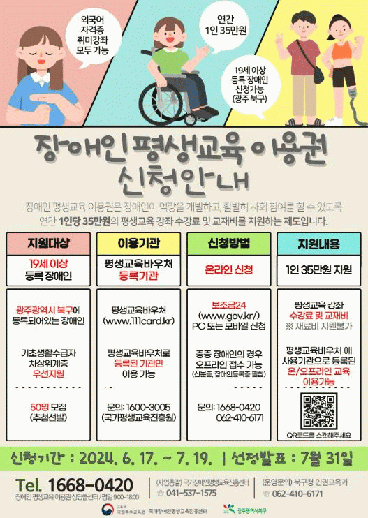 °ø¸ð ¼±Á¤¿¡ µû¶ó ºÏ±¸´Â 19¼¼ ÀÌ»ó µî·Ï Àå¾ÖÀÎ 50¸í¿¡°Ô Æò»ý±³À° °Á ¼ö°·á ¹× ±³Àçºñ·Î ¾µ ¼ö ÀÖ´Â Æò»ý±³À° ¹Ù¿ìó¸¦ 1ÀÎ´ç ¿¬°£ ÃÖ´ë 35¸¸ ¿ø±îÁö Áö¿øÇÒ °èȹÀÌ´Ù.