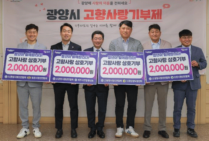 À̹ø ±âºÎ´Â °íÇâ»ç¶û±âºÎÁ¦ Âü¿©¸¦ À§ÇØ ±¤¾ç½Ãû³â¿¬ÇÕȸ°¡ Á÷Á¢ ÀڸŰῬ ´Üü¿¡ Á¦¾ÈÇØ ¼º»çµÈ °ÍÀ¸·Î, °¢ ¿¬ÇÕȸ¿Í 20¸í¾¿ 200¸¸ ¿øÀ» »óÈ£±âºÎÇØ ÃÑ 800¸¸ ¿øÀÇ ±âºÎ±ÝÀ» ±¤¾ç½Ã¿¡ Àü´ÞÇß´Ù.
