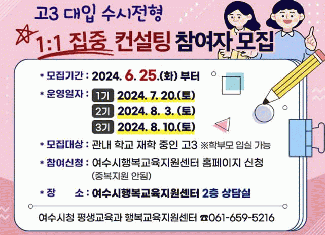 ¸ðÁýÀοøÀº ÃÑ 200¿©¸íÀÌ¸ç ¿À´Â ¡ã7¿ù 20ÀÏ ¡ã8¿ù 3ÀÏ ¡ã8¿ù 10ÀÏ ÃÑ 3ȸ¿¡ °ÉÃÄ ¿©¼ö½ÃÇູ±³À°Áö¿ø¼¾ÅÍ ÁøÇÐ »ó´ã½Ç¿¡¼ ÁøÇàÇÑ´Ù.
