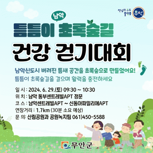 À̹ø Çà»ç´Â ³²¾Ç ±âÈÄ ´ëÀÀ µµ½Ã½£ Á¶¼º»ç¾÷ ÁذøÀ» ±â³äÇÏ¿© °³ÃÖµÇ¸ç ³²¾Ç Æ´»õ °ø°£¿¡ Á¶¼ºµÈ ÃʷϽ£À» °È°í °Ç°À» À§ÇÏ¿© ÀÏ»ó ¼Ó Æ´Æ´ÀÌ °È´Â ½Ã°£À» °®°íÀÚ ÃßÁøµÆ´Ù.