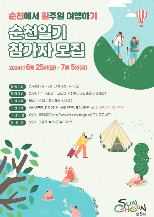 Âü°¡ÀÚ´Â 7 ºÎÅÍ 10Àϵ¿¾È ÀÚÀ¯¿©ÇàÀ» ÇÏ¸é¼ ¼øÃµ½Ã °ü±¤Áö È«º¸, Á¤¿ø¿öÄÉÀÌ¼Ç ¼÷¹Ú, ¡®³ª¸¸ÀÇ ¼øÃµ ¿©ÇàÄÚ½º¡¯ ÄÜÅÙÃ÷ Á¦ÀÛÇϱ⠵îÀÇ ¿©Çà°úÁ¦¸¦ ¼öÇàÇØ¾ß ÇÑ´Ù.