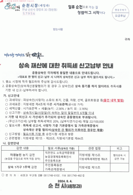 ÀÌ¿¡ ½Ã´Â »ç¸ÁÀÚ¸¦ ¹ßÃéÇÏ¿© °ü³» ¼ÒÀç ºÎµ¿»ê Á¶»ç, °¡Á·°ü°èÁõ¸í¼¿Í ºÎµ¿»êµî±âºÎµîº»À» ¿¶÷ÇÑ ÈÄ Ãëµæ¼¼¸¦ ¹Ìó ½Å°íÇÏÁö ¾ÊÀº »ó¼ÓÀÎ(¿¬´ë³³¼¼Àǹ«ÀÚ)¿¡°Ô »ó¼Ó Àç»ê¿¡ ´ëÇÑ Ãëµæ¼¼ ½Å°í¡¤³³ºÎ ¾È³»¹®À» ¸Å¿ù ¹ß¼ÛÇϰí ÀÖ´Ù.
