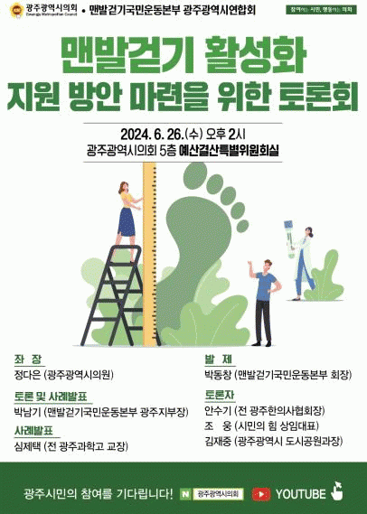 ÁÂÀåÀ» ¸ÃÀº Á¤´ÙÀº ÀÇ¿øÀº ¡°ÃÖ±Ù ¸Ç¹ß °È±â°¡ °Ç°¿¡ ÁÁ´Ù°í ¾Ë·ÁÁ® üÇèÇÏ´Â ºÐµéÀÌ ¸¹´Ù.¡± ¸ç ¡°À̹ø Åä·Ð °úÁ¤¿¡¼ µµÃâµÈ ´Ù¾çÇÑ ÀǰßÀ» Åä´ë·Î ±¤ÁֽùεéÀÇ °Ç°ÁõÁøÀº ¹°·Ð Ÿ Áö¿ª¿¡¼µµ ã¾Æ¿À´Â °Ç°µµ½Ã ±¤ÁÖ¸¦ ºê·£µùÇÏ´Â ±âȸÀÇ ÀåÀÌ µÇ±â¸¦ ±â´ëÇÑ´Ù.¡±°í °Á¶Çß´Ù