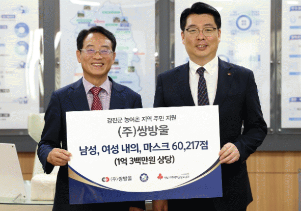 ¢ß½Ö¹æ¿ïÀº Áö³ 2022³â 12¿ù °Áø±º¿¡ 6,500¸¸¿ø »ó´çÀÇ ³»ÀÇ ¹× ¼Ó¿Ê 3¸¸8,700°³¸¦ ±âºÎÇßÀ¸¸ç, Áö¼ÓÀûÀÎ ³ª´® »çȸ°øÇå Ȱµ¿À» ÆîÃÄ¿À°í ÀÖ´Ù. À̹ø ±âºÎ´Â ³ó¾îÃÌ Áö¿ªÀÇ ¾î·Á¿î ÀÌ¿ôÀ» Áö¿øÇß´Ù.