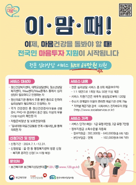 ÀÌ »ç¾÷Àº ¿ì¿ï¡¤ºÒ¾È µî Á¤¼Àû ¾î·Á¿òÀÌ ÀÖ´Â ±¹¹Î¿¡°Ô Àü¹®ÀûÀÎ ½É¸®»ó´ã ¼ºñ½º¸¦ Á¦°øÇÏ´Â »ç¾÷À¸·Î Èñ¸ÁÀÚ¿¡°Ô ÃÖ¼Ò 50ºÐ ÀÌ»ó 1:1 ´ë¸é ½É¸®»ó´ã ¼ºñ½º¸¦ ÃÑ 8ȸ ¹ÞÀ» ¼ö ÀÖ´Â ¹Ù¿ìó¸¦ Á¦°øÇÑ´Ù.
