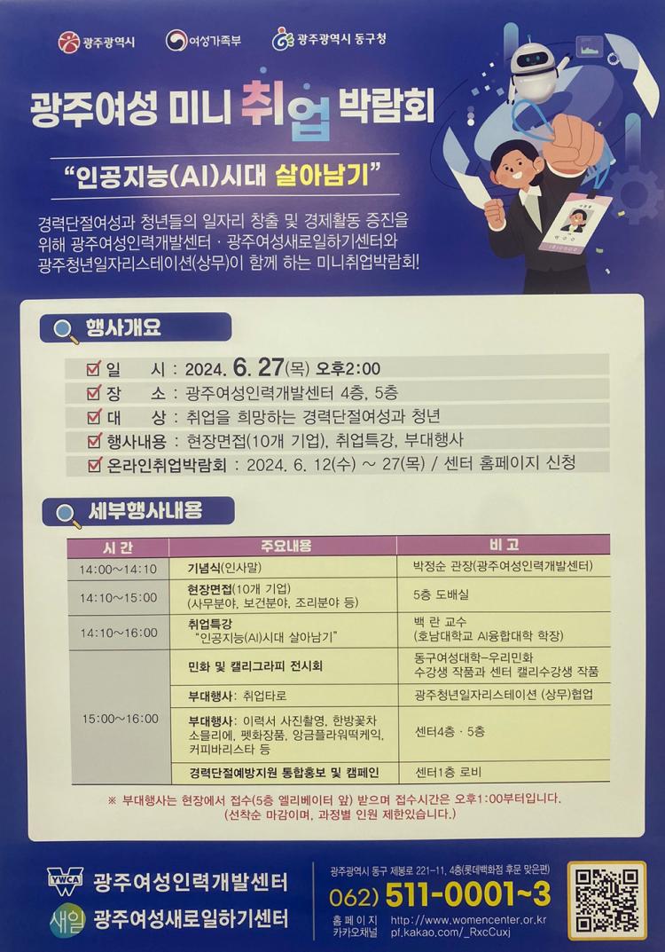 'ÀΰøÁö´É ½Ã´ë¿¡¼ »ì¾Æ³²±â'¸¦ ÁÖÁ¦·Î ±¤ÁÖ¿©¼ºÀη°³¹ß¼¾ÅÍ¿¡¼ ½Ç½ÃµÈ À̳¯ °¿¬Àº °æ·Â´ÜÀýÀ» °Þ°í Ãë¾÷À» ÁغñÇÏ´Â ¿©¼º°ú û³âµéÀ» ´ë»óÀ¸·Î AI ±â¹Ý Ãë¾÷ ½ÃÀå¿¡¼ Ž»öÇÏ°í ¼º°øÇÏ´Â µ¥ µµ¿òÀÌ µÇ´Â ÅëÂû·Â°ú ¿ª·®°³¹ß Àü·«À» Á¦°øÇÏ¿´´Ù.