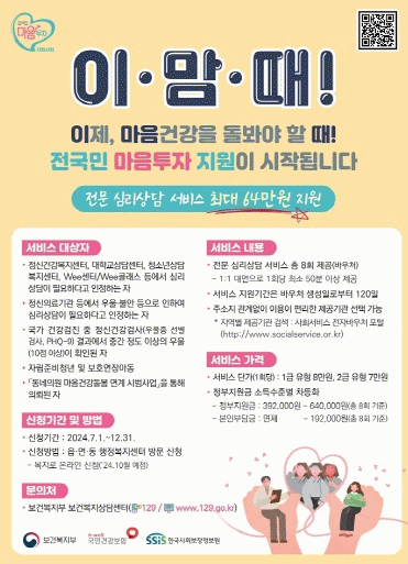 Áö¿ø´ë»óÀº Á¤½Å°Ç°º¹Áö¼¾ÅÍ, ´ëÇб³»ó´ã¼¾ÅÍ, û¼Ò³â »ó´ãº¹Áö¼¾ÅÍ, Wee¼¾ÅÍ/Wee Ŭ·¡½º µî¿¡¼ ½É¸®»ó´ãÀÌ ÇÊ¿äÇÏ´Ù°í ÀÎÁ¤ÇÏ´Â ÀÚ, Á¤½ÅÀÇ·á±â°ü µî¿¡¼ ¿ì¿ï ºÒ¾È µîÀ¸·Î ÀÎÇÏ¿© ½É¸®»ó´ãÀÌ ÇÊ¿äÇÏ´Ù°í ÀÎÁ¤ÇÏ´Â ÀÚ, ±¹¹Î °Ç°°ËÁø Áß Á¤½Å°Ç°°Ë»ç(¿ì¿ïÁõ ¼±º°°Ë»ç) °á°ú¿¡¼ Áß°£ Á¤µµ ÀÌ»óÀÇ ¿ì¿ïÀÌ È®ÀÎµÈ ÀÚ, ÀÚ¸³Áغñ û³â ¹× º¸È£¿¬Àå ¾Æµ¿, ?µ¿³×ÀÇ¿ø ¸¶À½°Ç°µ¹º½ ¿¬°è ½Ã¹ü»ç¾÷? ÅëÇØ ÀÇ·ÚµÈ ÀÚ°¡ ÇØ´çµÈ´Ù.