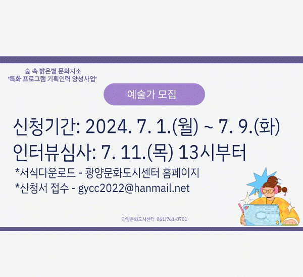 ÇöÀç ¿À´Â 9ÀϱîÁö ±¤¾ç½Ã¸¦ »ýȰ±ÇÀ¸·Î ÇÏ´Â ¿¹¼ú°¡¿Í ¿¹¼ú°»ç¸¦ ´ë»óÀ¸·Î Âü¿©ÀÚ ½ÅûÀ» ¹Þ°í ÀÖ´Ù.