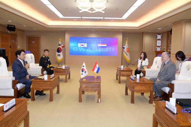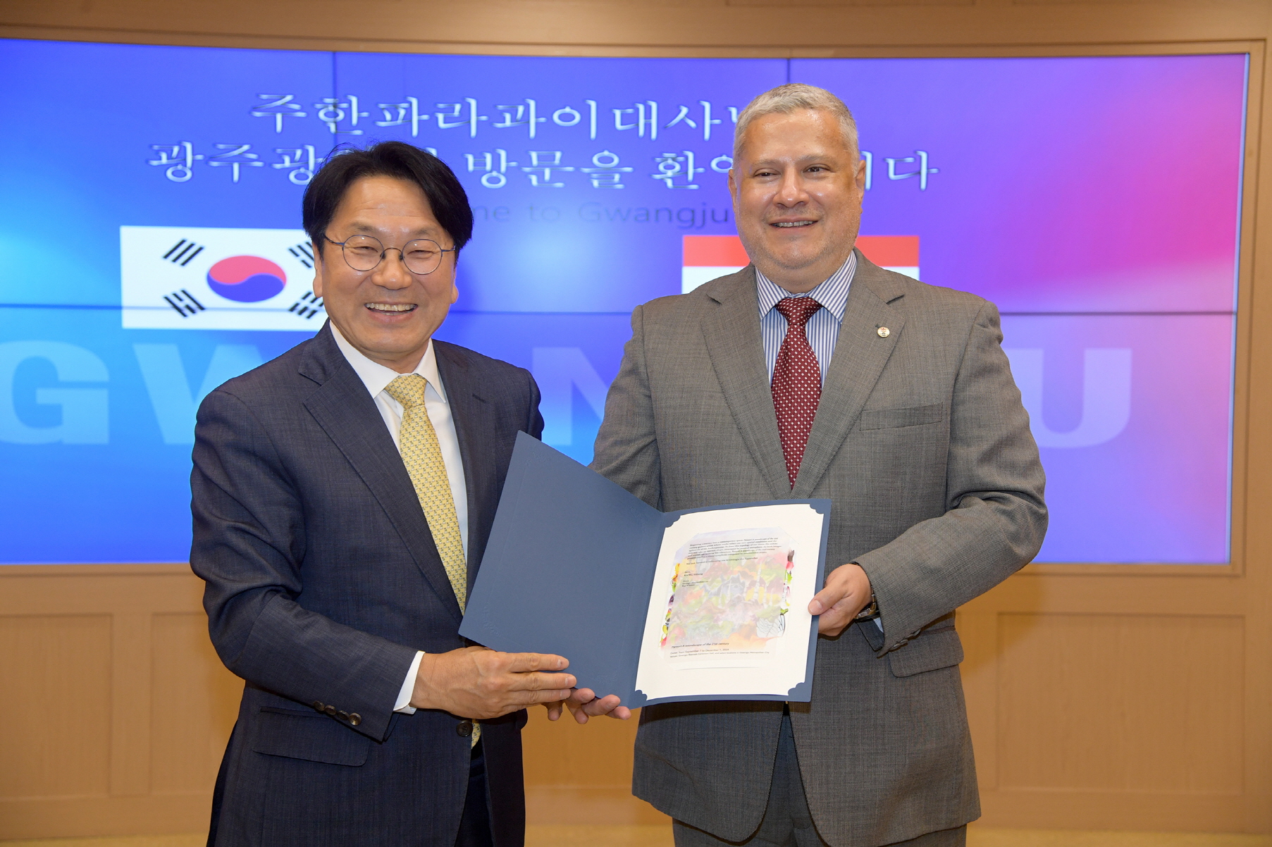 °±âÁ¤ ±¤ÁÖ±¤¿ª½ÃÀåÀº 9ÀÏ ½Ãû 3Ãþ Á¢°ß½Ç¿¡¼ ¹Ì°Ö ¾ÓÇï ¿ì¹ßµð³ë ·Î¸Þ·Î ¾Ë¹Ù·¹½º ÁÖÇÑ ÆÄ¶ó°úÀÌ ´ë»ç¿Í Á¢°ßÇß´Ù.